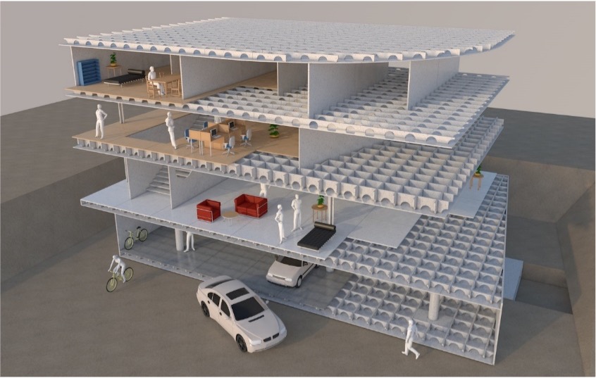 Gegenüber dem heutigen Betonbau können bis zu 75% an Ressourcen eingespart werden. Nach dem Lebensende des Bauwerkes können die Bauteile wieder in neuen Bauten eingesetzt werden. Betrachtet man den gesamten Kreislauf, kann auch der Fussabdruck gegenüber heutigen Bauweisen um bis zu 75% verkleinert werden.